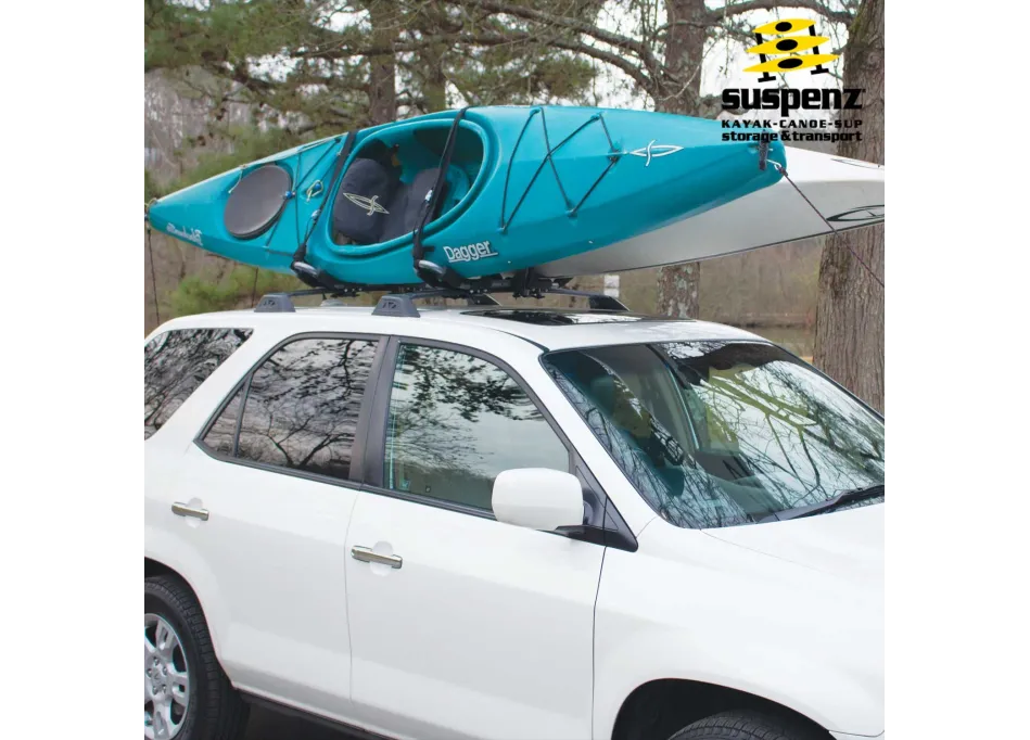 Tired of wrestling heavy boats onto your roof? Discover effortless water adventures with our innovative boat roof rack featuring patented Suspenz Roller-Assist™ technology. Integrated EZ Roller™ pads glide your vessel smoothly into position—no more straining during easy boat loading or unloading! Engineered with a stable 39-inch V-rack design, this system securely cradles wide kayaks, canoes, and heavier crafts using the traditional bottom-side-down method you trust.
